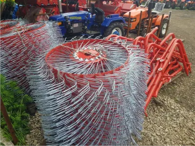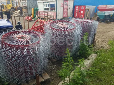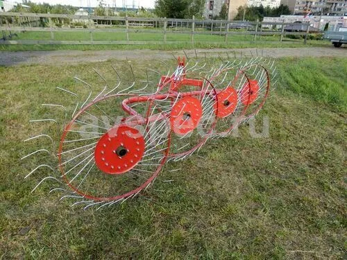 Этот механизм не нуждается в подключении к валу отбора мощности мини-трактора. Перед началом работы агрегат выставляется под определенным углом к траектории движения трактора, и колеса ‒ звездочки приводятся во вращение за счет сцепления с грунтом выступающих из ободьев упругих стальных «пальцев» диаметром 7 мм. Кроме земли, эти стержни контактируют со скошенной травой, и за счет особой изогнутой формы, а также в зависимости от положения механизма, разбрасывают или сгребают её в валки.