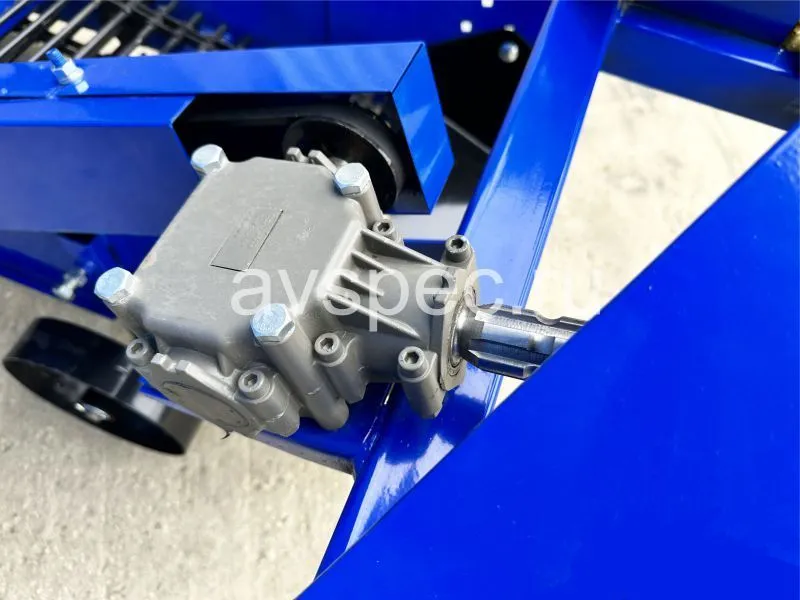 Это инструмент для выкапывания картофеля с ножом, лентой и колесами. Нож вырезает землю с клубнями и отправляет их на транспортерный механизм. Тот в свою очередь поднимает и раскладывает картофель на поверхности для сбора. Длина транспортера 950 мм. Устройство соединяется с трактором, минимальная мощность которого 18 л.с. со сцепкой и ВОМ.